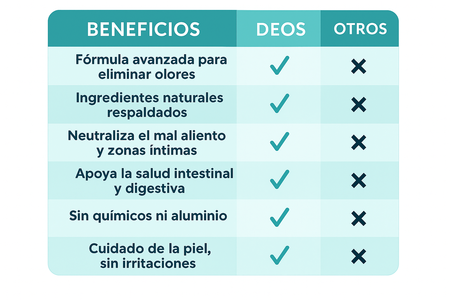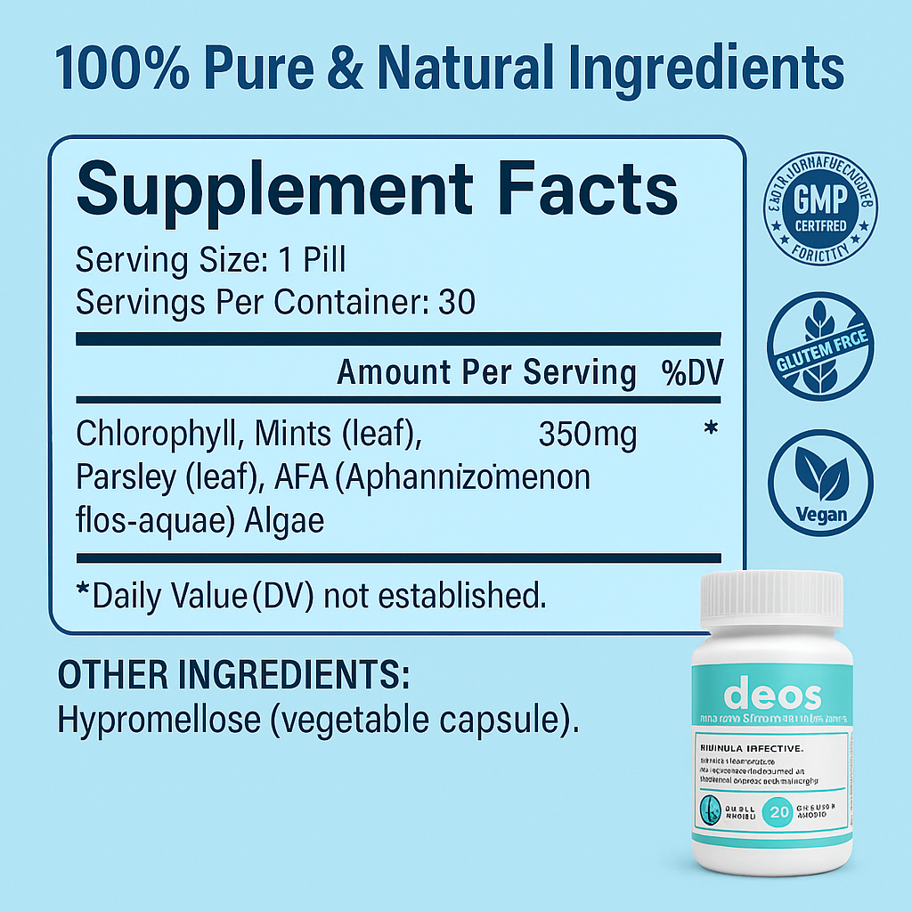No todos los suplementos son iguales. Mientras otros solo enmascaran los olores con químicos, DEOS actúa desde el interior gracias a su fórmula natural con clorofila, menta, perejil y algas AFA.