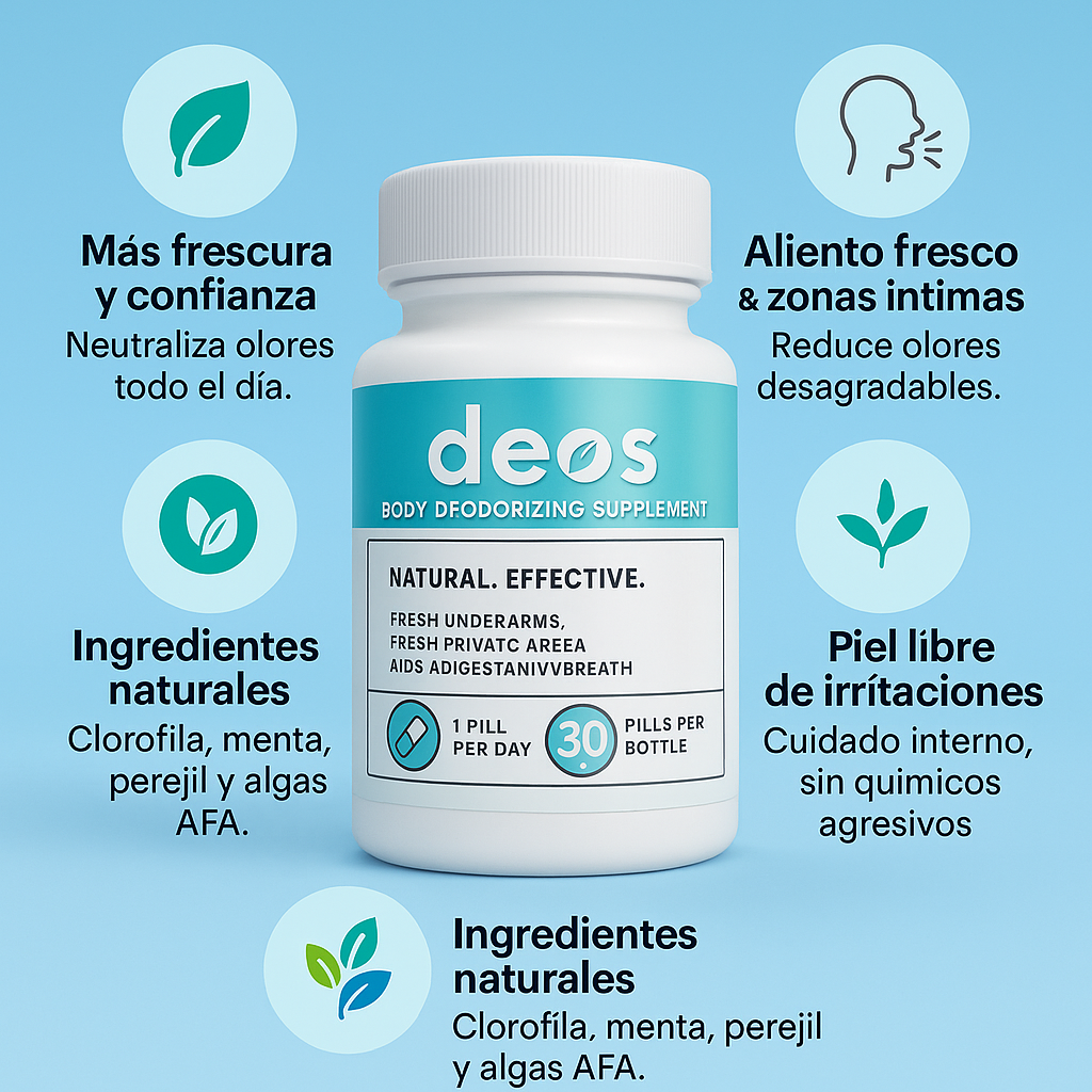 DEOS es un suplemento natural que actúa desde el interior, neutralizando los olores desagradables y brindándote frescura durante todo el día.