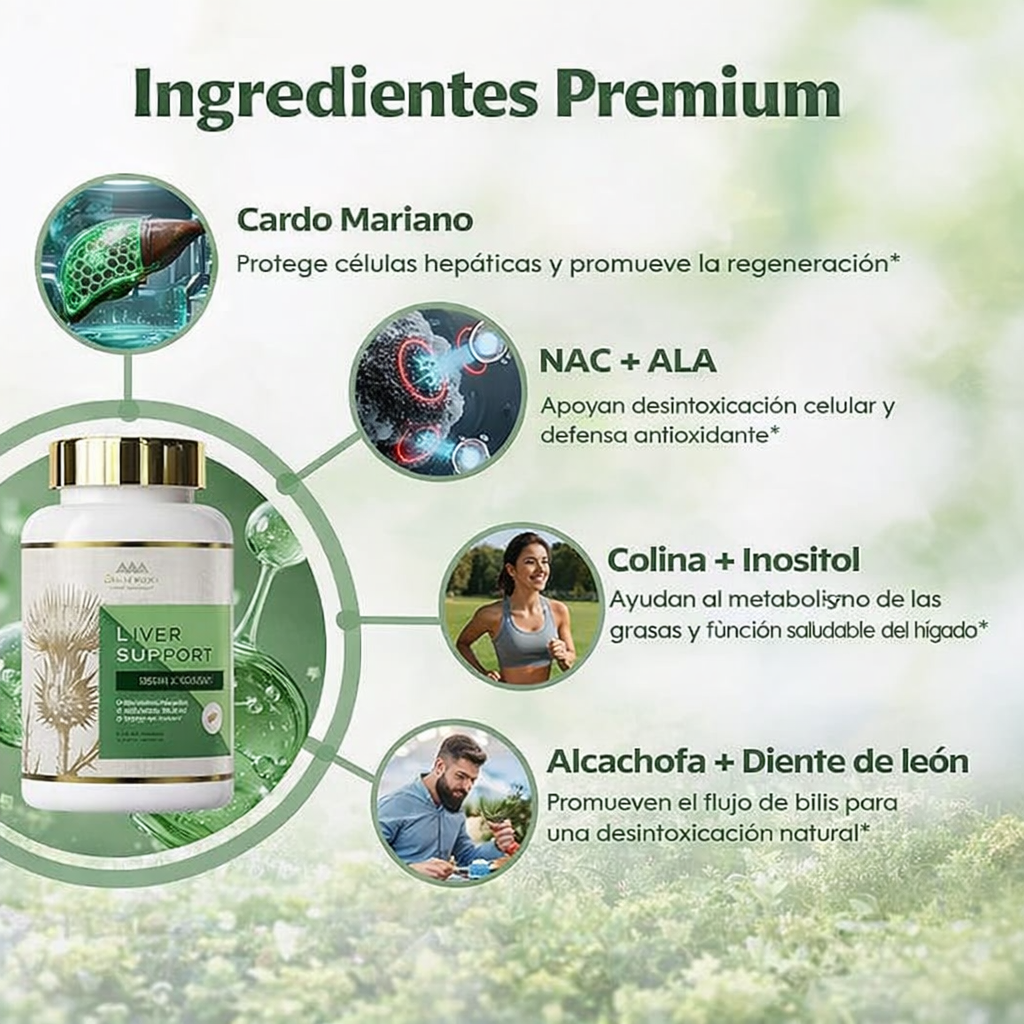 LIVER SUPPORT combina ingredientes naturales de alta calidad, cuidadosamente seleccionados para apoyar la salud del hígado, favorecer la desintoxicación natural del organismo y promover el bienestar general. Su fórmula avanzada integra compuestos esenciales que actúan en sinergia para apoyar la función hepática, la digestión y la protección celular frente al estrés oxidativo.